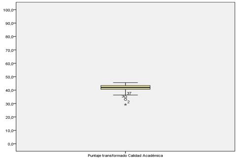 La descripción general del evento calidad académica es determinada a partir del cuadro de puntaje bruto transformado, la mediana y el gráfico de caja donde se muestran los valores mínimos y máximos del evento estudiado.
