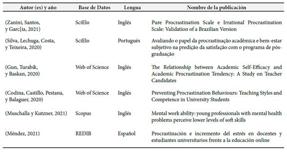 Scopus, Redib, Redalyc, ScienceDirect y Web of Science. Finalmente, se concluyó que la procrastinación