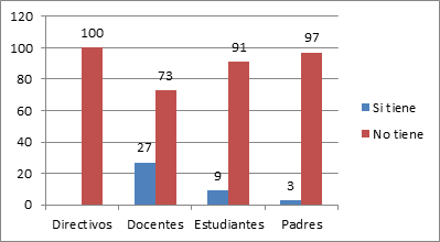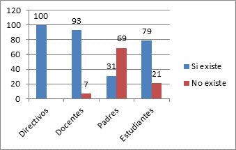 En relación a la existencia de la violencia escolar, las autoridades en un 100% consideran que existen manifestaciones de violencia en la escuela, sin embargo consideran que no salen a la luz pública todas sino las que son de gravedad o cuando alguna persona reclama; esta percepción es corroborada por los maestros quienes en un 93% consideran que existe violencia, mientras los padres de familia solo en un 31.46% de los padres de familia considera la existencia de violencia en escolar, frente a un 68.5% que considera que no conoce o no tiene información sobre la existencia de violencia; mientras que un 79% de los estudiantes declaran que existe violencia escolar. (Ver tabla 1 y gráfico 1).
