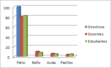 La violencia se desarrolla en diferentes lugares o espacios de la escuela, es así que un 80% de los estudiantes y el 82% de los maestros consideran que el lugar de preferencia para que se originen actos de violencia es el patio y el 10% y 8% respectivamente declaran que es en el baño donde se desarrolla la violencia. El 100% de las autoridades consideran el patio como el lugar en el cual se observa la violencia. El porcentaje restante está considerado en las aulas (Ver tabla 2 y gráfico 2).